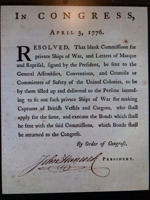 Letters of marque were issued to commanders of boats providing them permission to attack British ships- both military and merchant. Rules were established for engagement and the distribution of valuable cargo seized at sea. This practice was a more civilized form of piracy, but with only an infant navy, this measure was deemed critical by the Continental Congress as war efforts intensified.